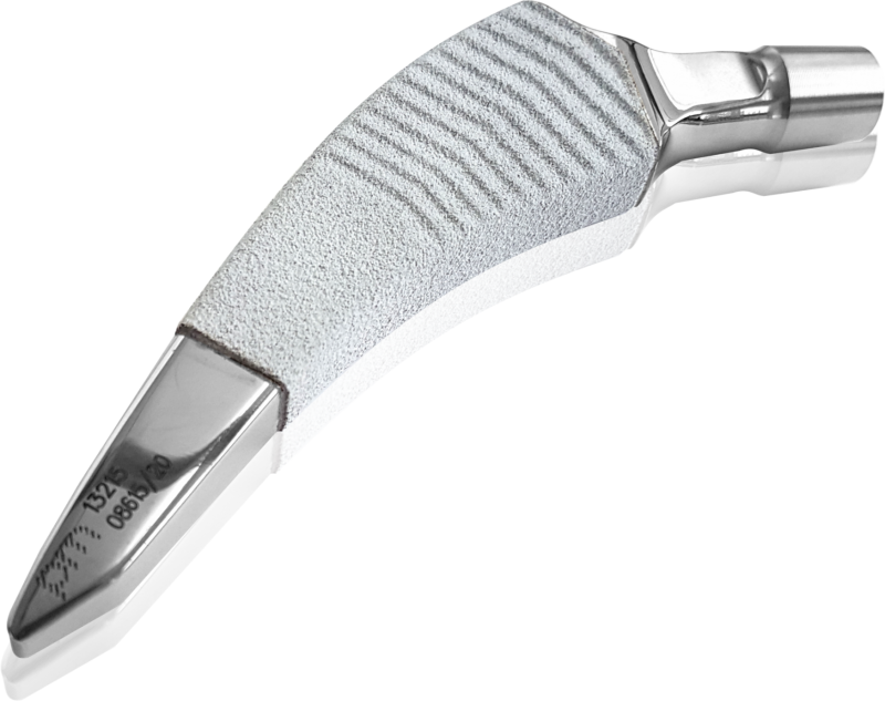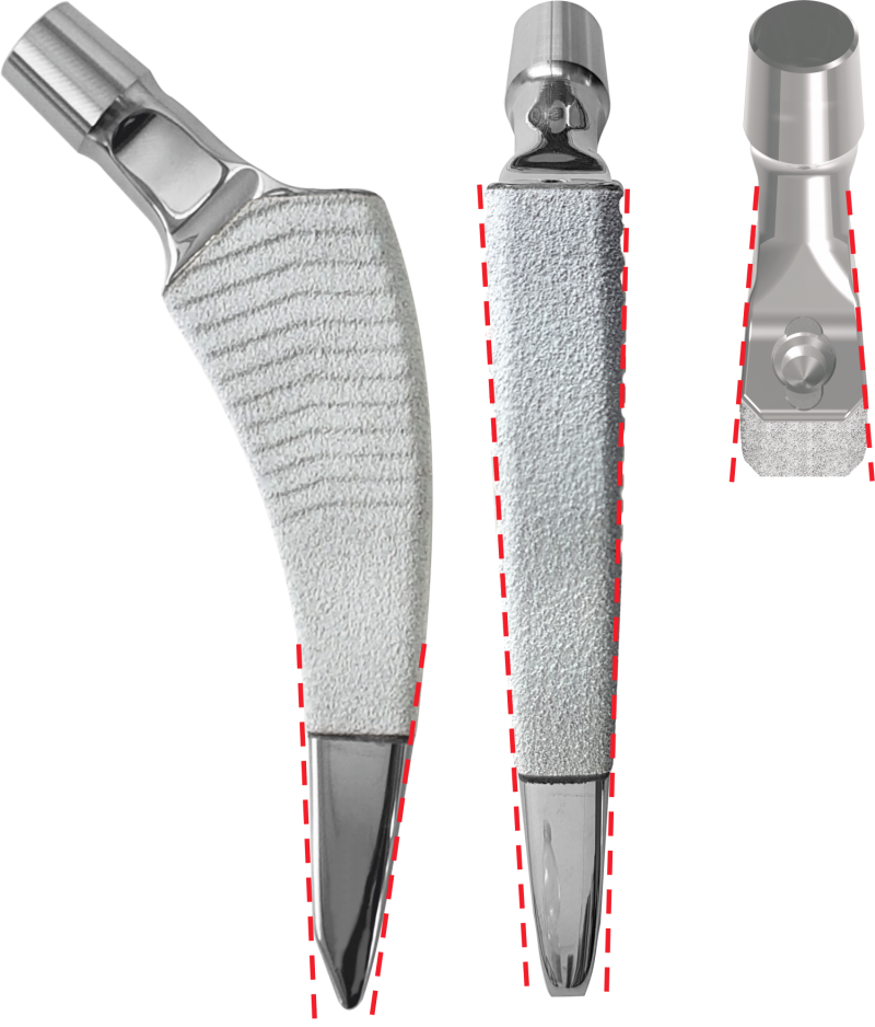 Potrójnie zwężająca się konstrukcja (przednia, czołowa i strzałkowa) wspiera stabilność osiową i rotacyjną, sprzyjając rozkładowi obciążenia w obszarze przynasadowym.