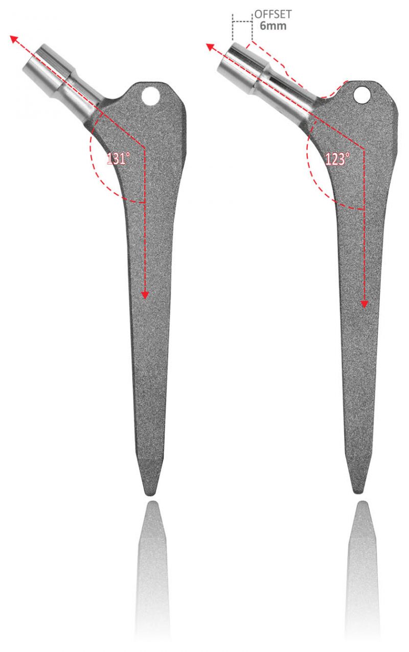 Wsporniki PBF są dostępne w wersji standardowej (CCD 131°) oraz w wersji lateralizowanej z CCD 123° i przesunięciem zmiennym od +6 do +7,8 mm w porównaniu z odpowiednim rozmiarem trzpienia w wersji standardowej.