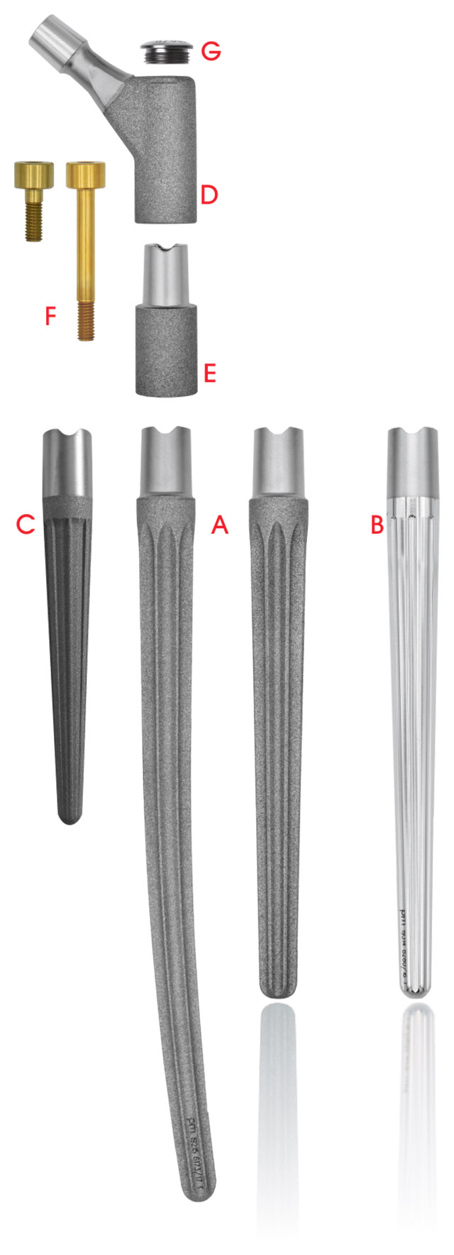 Szeroka gama trzpieni trzonowych dostępnych w różnych długościach i średnicach, wciskanych lub cementowanych, pozwala na maksymalne dopasowanie anatomiczne i przywrócenie prawidłowej geometrii stawu.