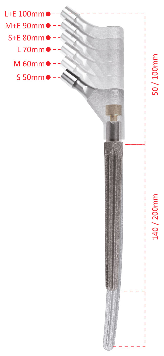 Dzięki modułowości elementu możliwe jest osiągnięcie długości od 190mm do 300mm. Po wprowadzeniu idealnego trzpienia do trzonu, proksymalne wychylenie od 50 mm do 100 mm jest osiągalne poprzez połączenie trzonu przynasadowego i ostatecznie trzonu przedłużającego.